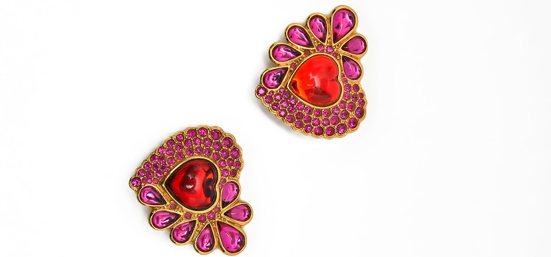 Редкие винтажные клипсы со знаковым для Дома YSL сочетанием цветов — красного и фиолетового. Потрясающий дизайн — в центре кабошон в форме сердца рубинового цвета, с одной стороны его обрамляют кристаллы.