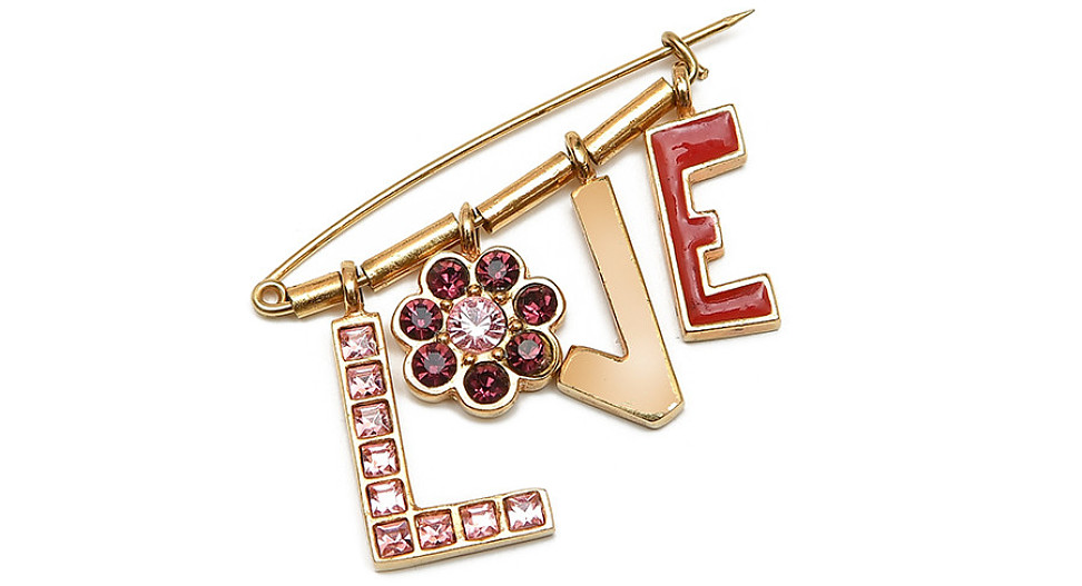 Брошь-булавка с подвесами — стильный аксессуар для любого образа. Изделие выполнено из металла золотого цвета и дополнено подвесами с надписью «love». Буквы украшены кристаллами и эмалью, «O» сделана в виде цветка.