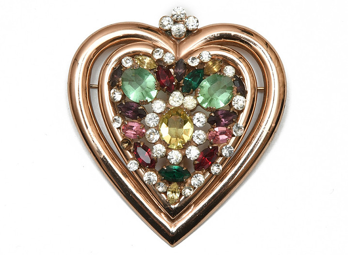 Крупная эффектная брошь с разноцветными кристаллами. Композиция из кристаллов разных форм, размеров и оттенков повторяет форму сердца и является центральной частью броши. Коллекционное и роскошное украшение от знаменитого бренда Coro станет прекрасным подарком.