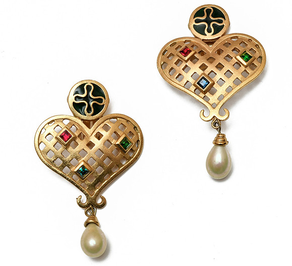 Эти редкие клипсы от бренда Кристиан Лакруа выполнены из металла цвета желтого золота и украшены разноцветными кристаллами и зеленой эмалью. К верхней круглой части клипс с эмалью прикреплена подвижная нижняя часть в виде сердца.