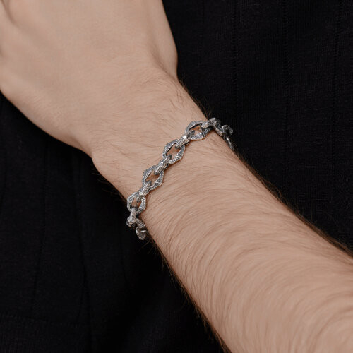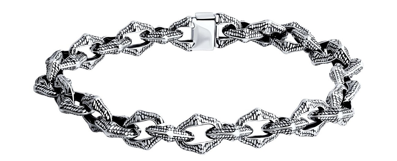 Сильный браслет из черненого серебра — идеальный аксессуар для мужчины, который ценит утонченность и элегантность в деталях. Специальная техника придает украшению роскошный блеск, а строгий дизайн подчеркивает мужественность и уверенность его владельца. Такой браслет прекрасно дополнит как повседневный, так и более торжественный образ.